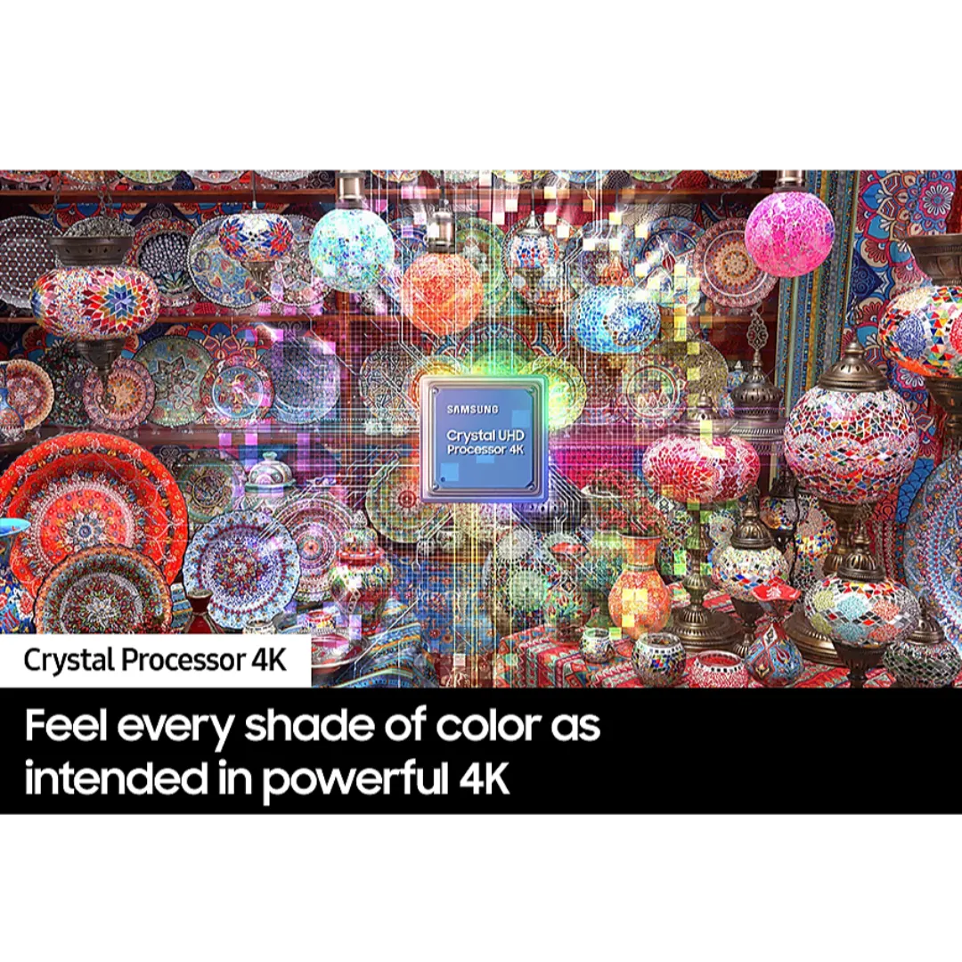 The Samsung Crystal UHD Processor 4K chip is on display in the middle amidst many colorful plates and ornaments.